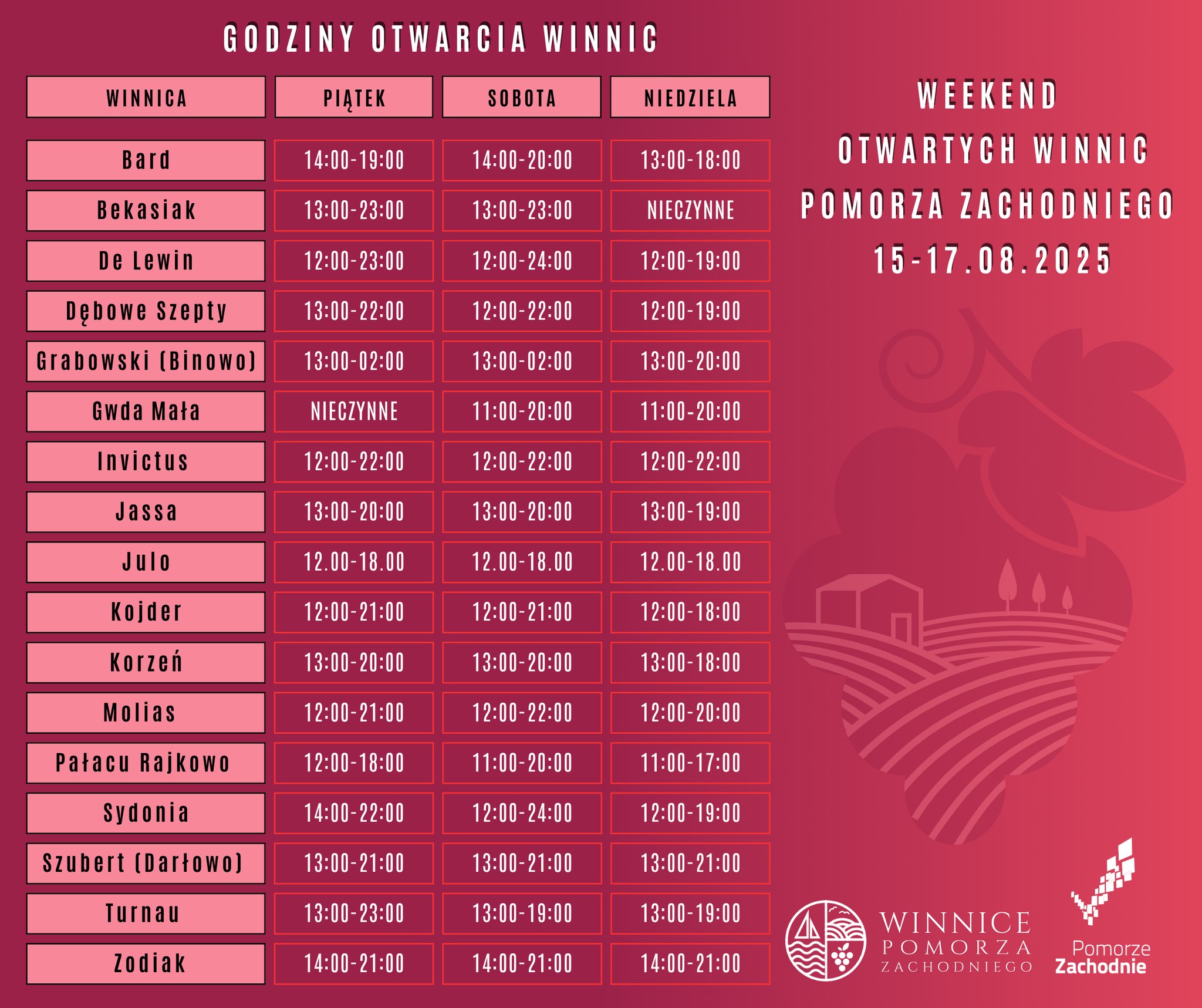 III Weekend Otwartych Winnic Pomorza Zachodniego potrwa od piątku 15 sierpnia do niedzieli 17 sierpnia. Wstęp do wszystkich winnic jest bezpłatny i nie wymaga wcześniejszych rezerwacji. Pełna lista uczestniczących winnic oraz harmonogram wydarzeń dostępne są na profilu Winnice Pomorza Zachodniego na Facebooku.
