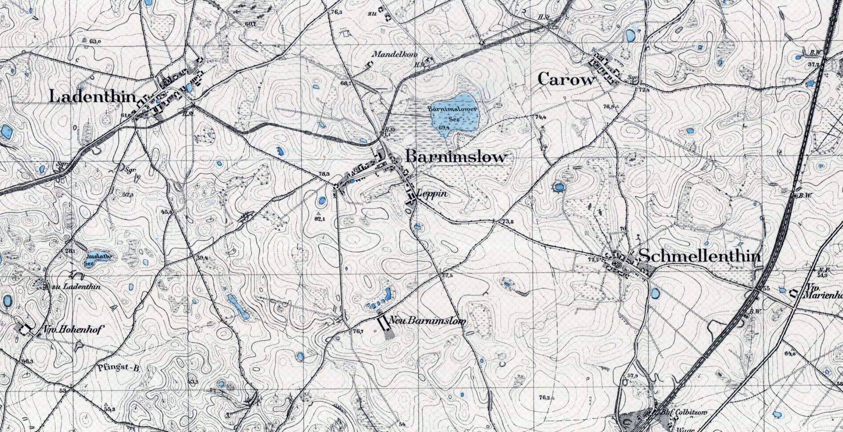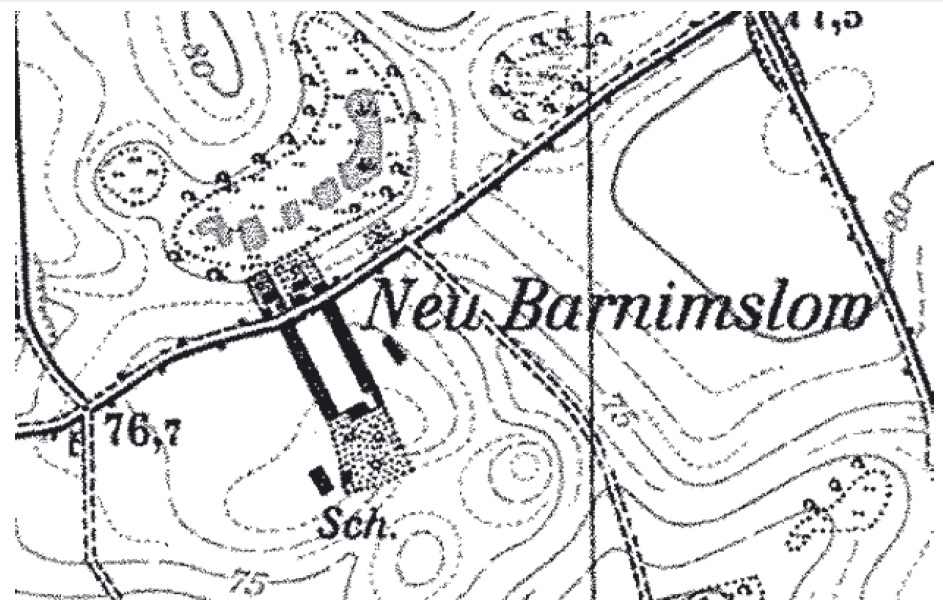Lokalizację widać na przedwojennej mapie. W 1892 roku właścicielem Neu Barnimslow był baron von Brockdorff. Majątek liczył wówczas 235 ha, w tym 220 ha zajmowały pola uprawne z ogrodami, 15 ha zajmowały łąki.