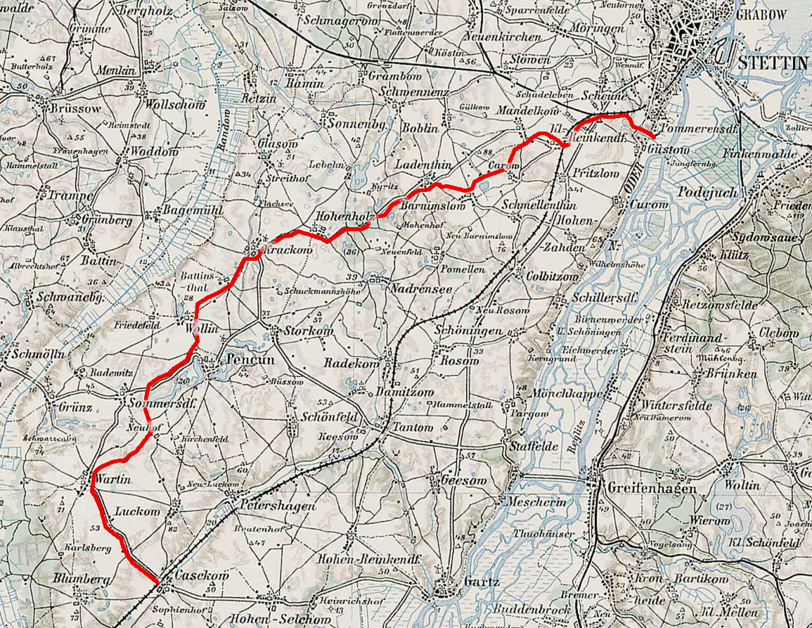 Jak wynika z rozkładu jazdy z lat trzydziestych, podróż z Casekow do Pomorzan trwała średnio około 2 godzin i 15 minut, często dłużej, bo np. na stacji w Pankow potrafiły stać nawet pół godziny, a na Gumieńcach 10-12 minut. Dla porównania – dzisiejszy rowerzysta, jadący spokojnym tempem, nie ustępowałby pociągowi CPO z lat trzydziestych. Ale w tamtych czasach nie chodziło o szybkość – ważniejsze było to, że kolej docierała niemal pod każdy dom.