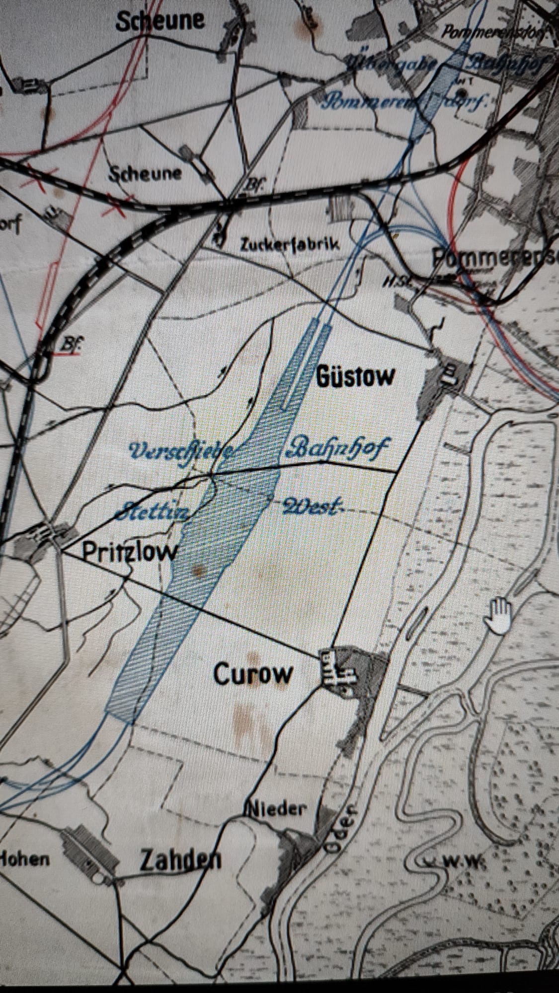 Na niektórych starych, niemieckich mapach widać dokładnie, gdzie bocznica miała powstać. To pas ziemi biegnący wzdłuż dzisiejszej obwodnicy Przecławia i Warzymic, nieco na wschód od nowej drogi. Na mapach widnieje też nazwa „Verschiebebahnhof Stettin West”, co można tłumaczyć jako „stacja rozrządowa Szczecin Zachód” albo „bocznica rozrządowa Szczecin Zachód”.