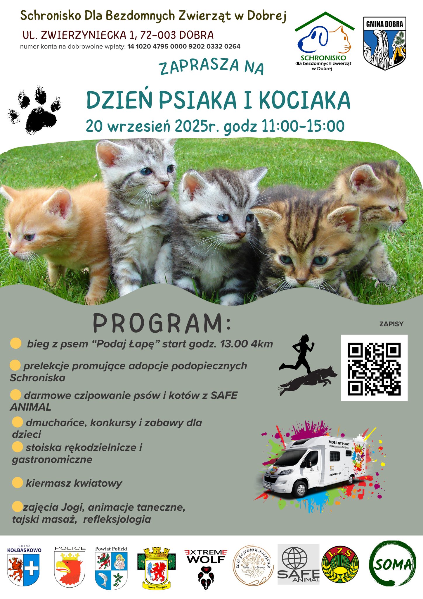 Dzień Psiaka i Kociaka odbywa się przy współpracy z Gminą Dobra, Gminą Kołbaskowo, Powiatem Polickim, Policami oraz licznymi organizacjami partnerskimi.