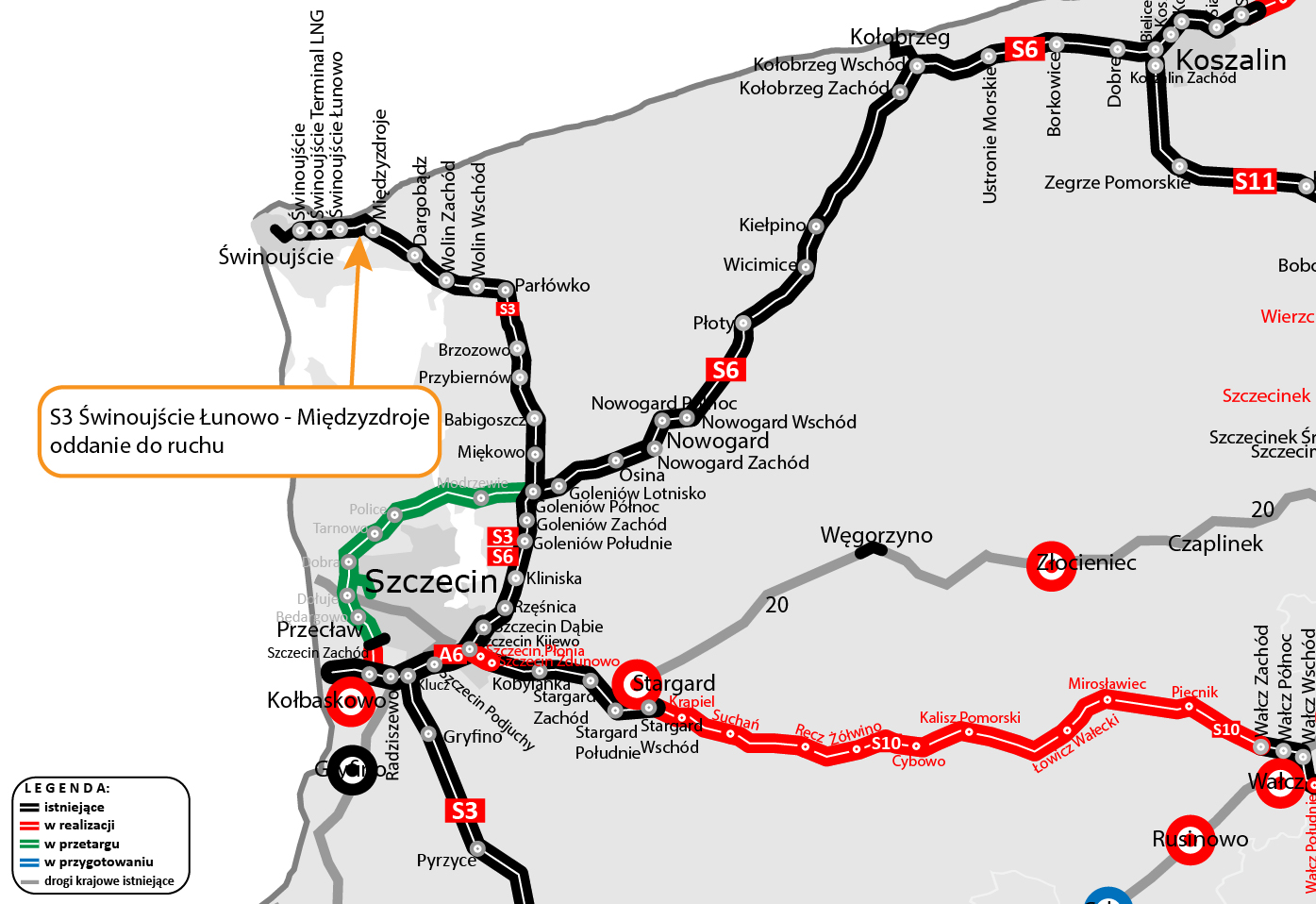 Oddano do użytku ostatni brakujący odcinek drogi ekspresowej S3 - między węzłem Świnoujście Łunowo a węzłem Międzyzdroje. Tym samym zakończono budowę całej trasy S3 w Polsce. Od teraz kierowcy mogą dwupasmową, darmową drogą podróżować od Świnoujścia nad Bałtykiem aż po Lubawkę, przy granicy z Czechami.
