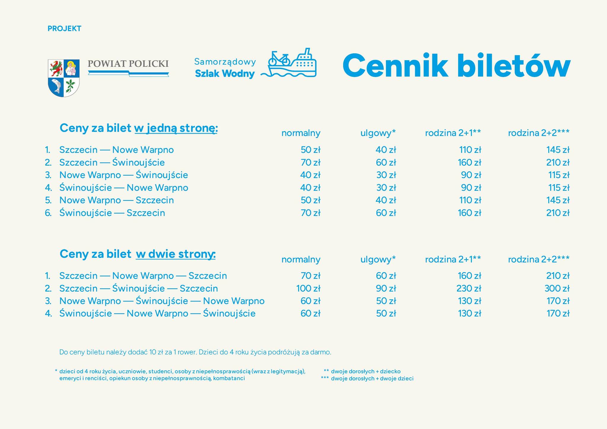 Koszt biletu na trasie Szczecin – Nowe Warpno ma wynosić 50 zł (normalny), a rejs do Świnoujścia – 70 zł. Będą też pakiety rodzinne, a dzieci do 4. roku życia popłyną za darmo. Z ulg skorzystają uczniowie, studenci, seniorzy, osoby z niepełnosprawnościami i ich opiekunowie oraz kombatanci.